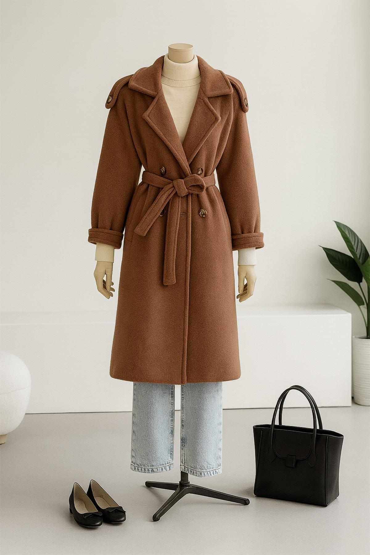 Apoletli Dört Düğmeli Kuşaklı Kaşe Kaban Kahve