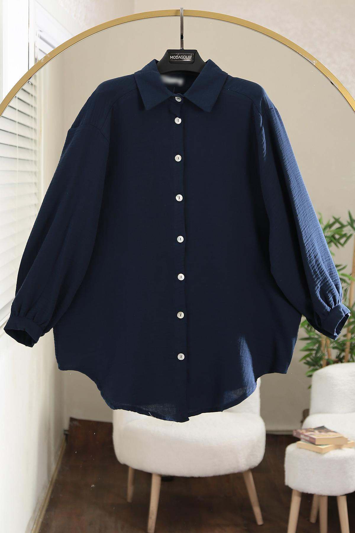 Arkası Bantlı Omuzu Dikişli Oversıze Müslin Gömlek Lacivert