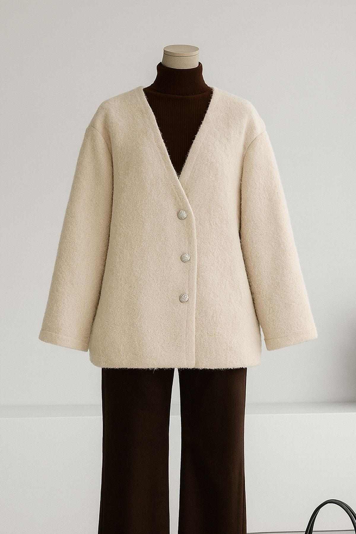 Asimetrik Üç Düğmeli Yünlü Kaşe Ceket Taş