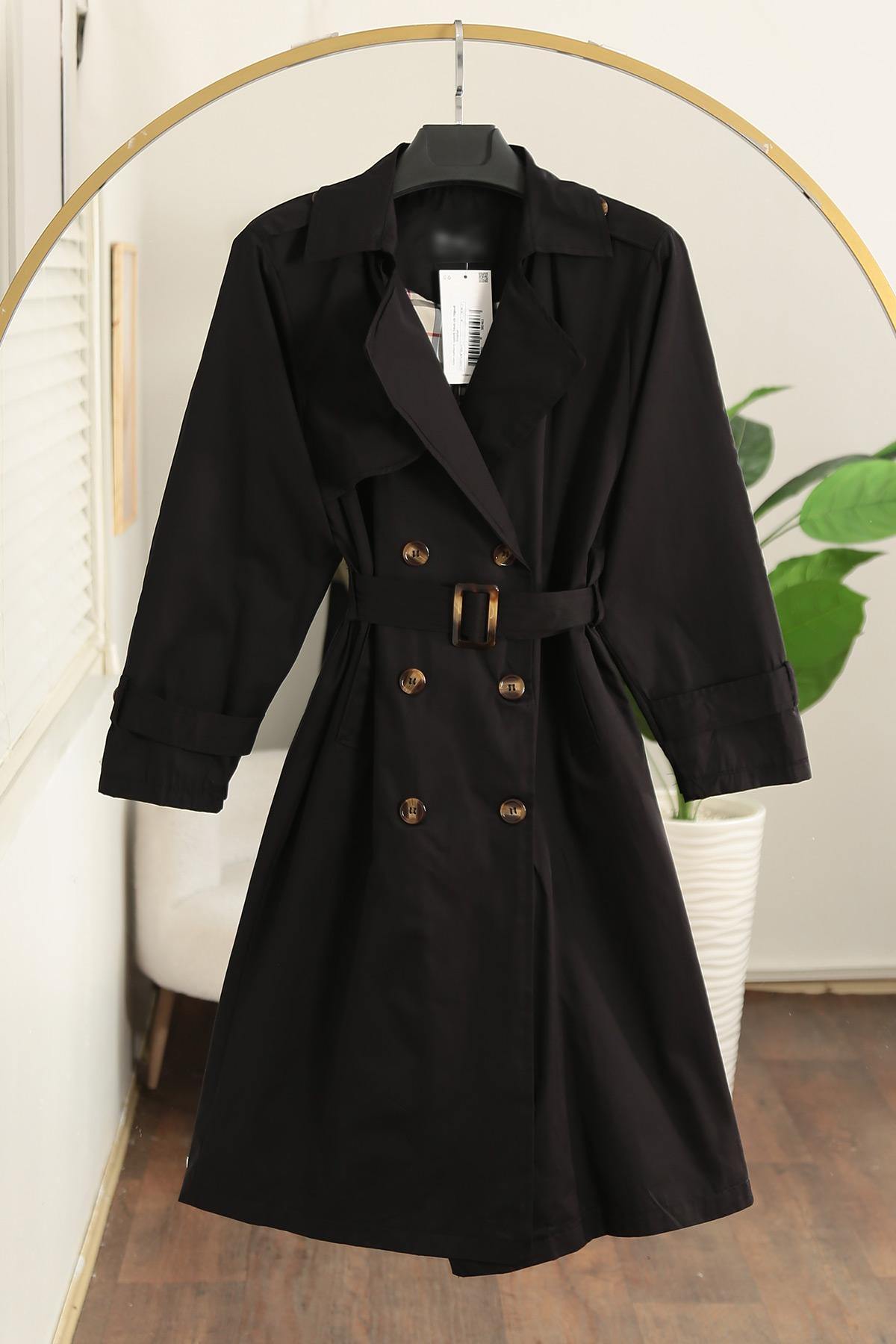 Astarı Burberry Apoletli Tokalı Altı Düğmeli Trençkot Siyah