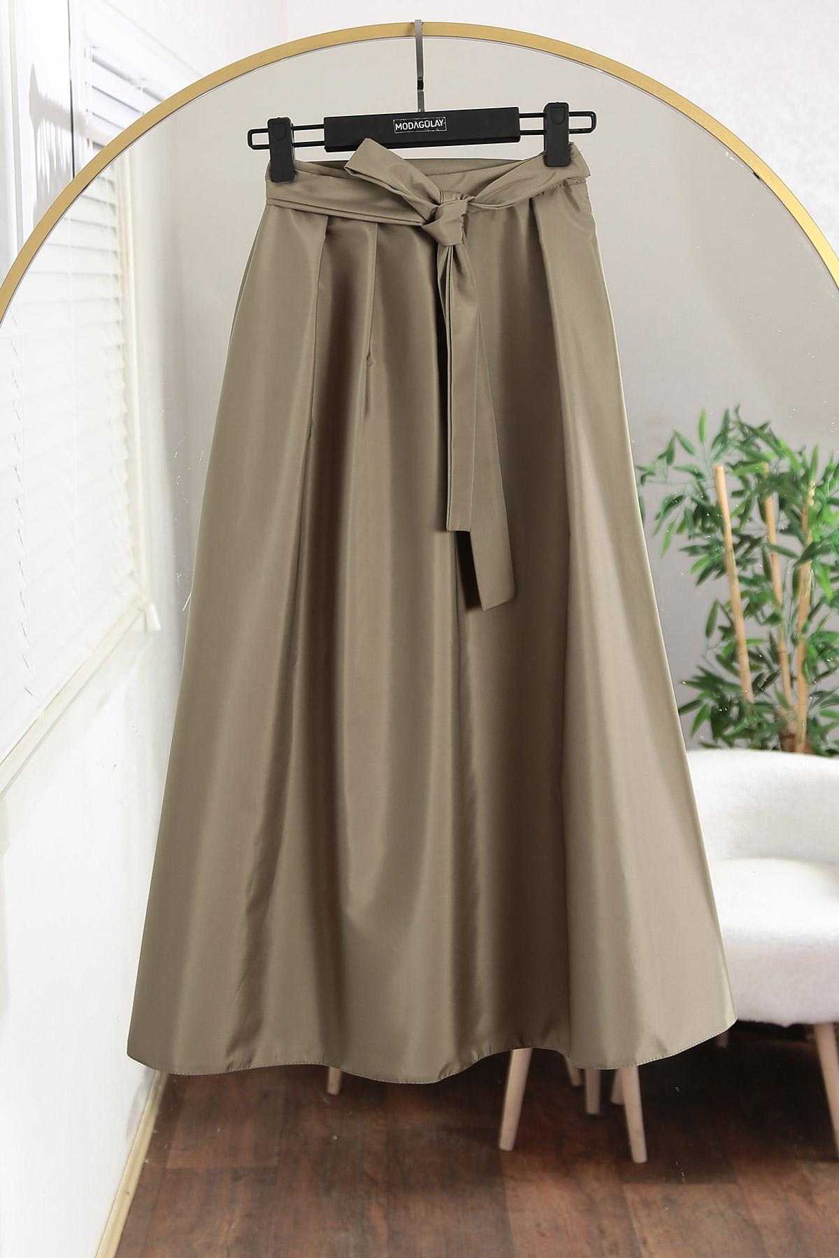 Bağlamalı Pileli Bondid Etek Haki