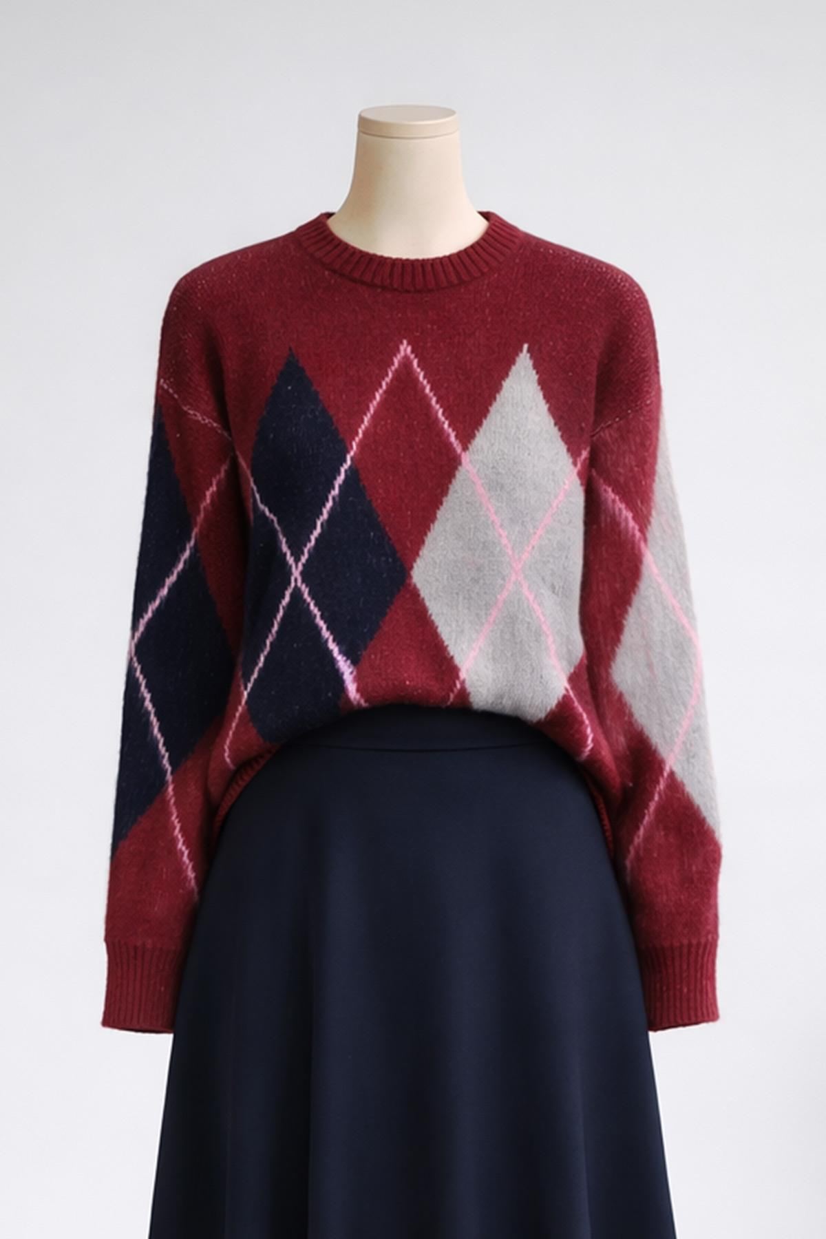 Baklava Desen Şardonlu Triko Kazak Bordo