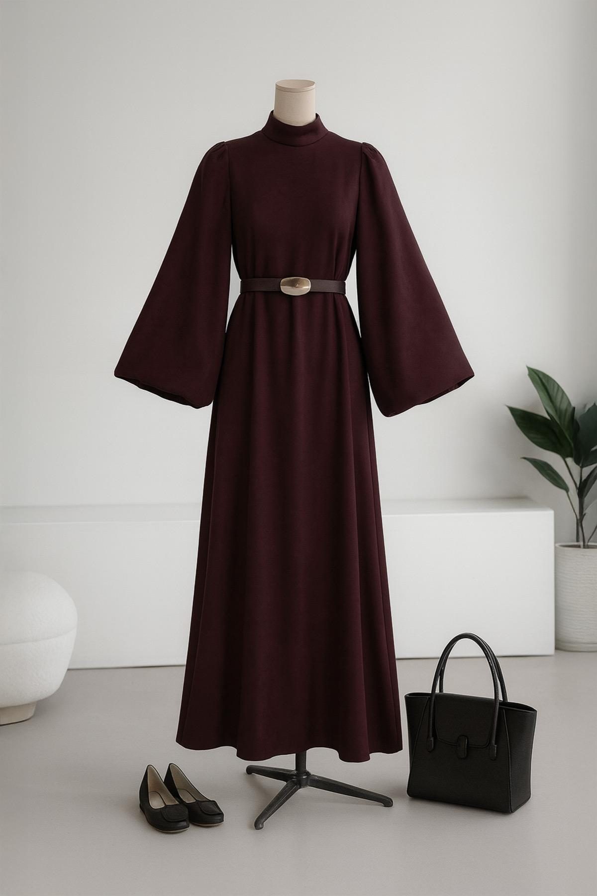 Balon Kollu Kemerli Süet Elbise Mürdüm