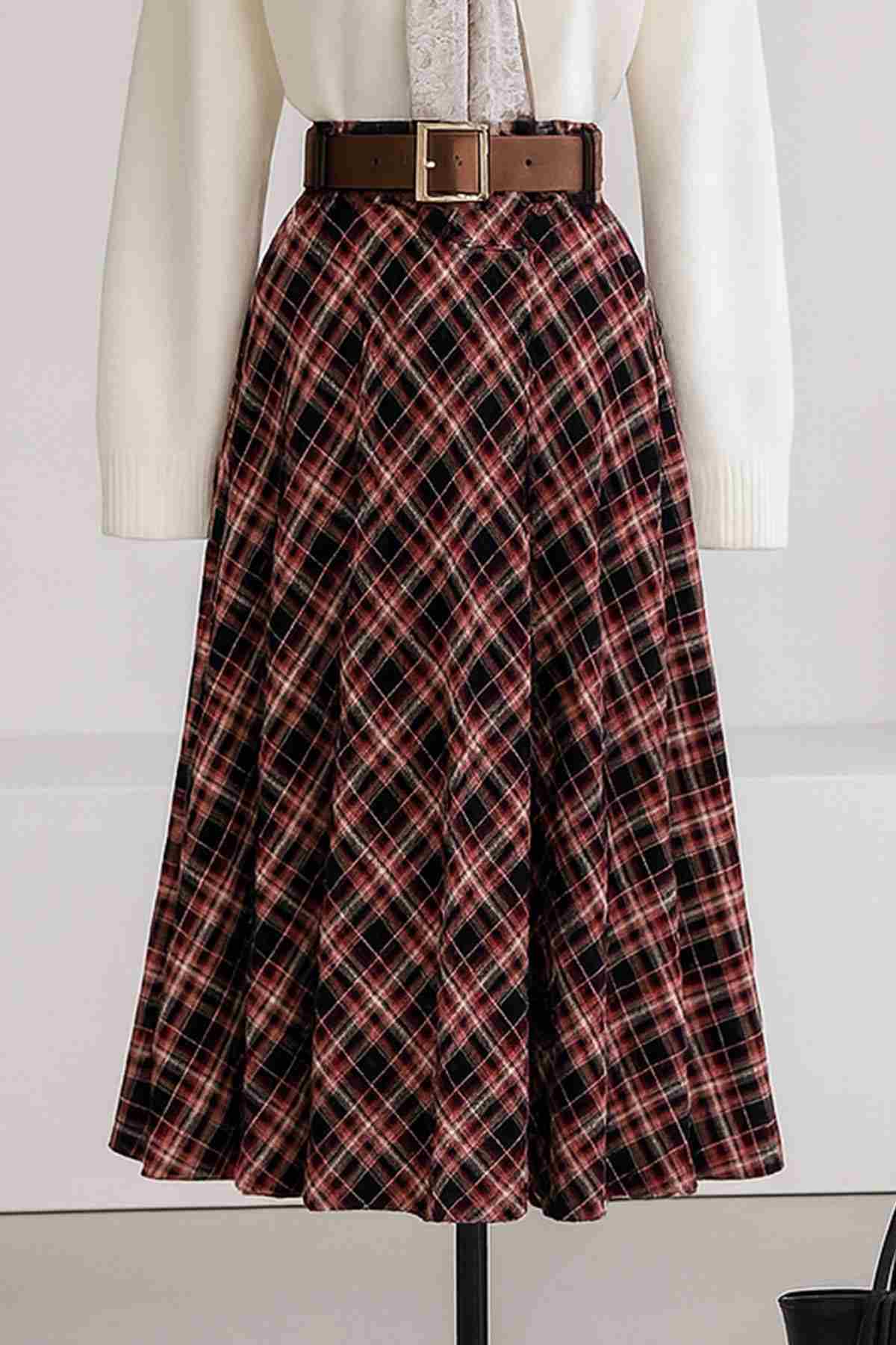 Beli Kemerli Ekoseli Çan Etek Bordo