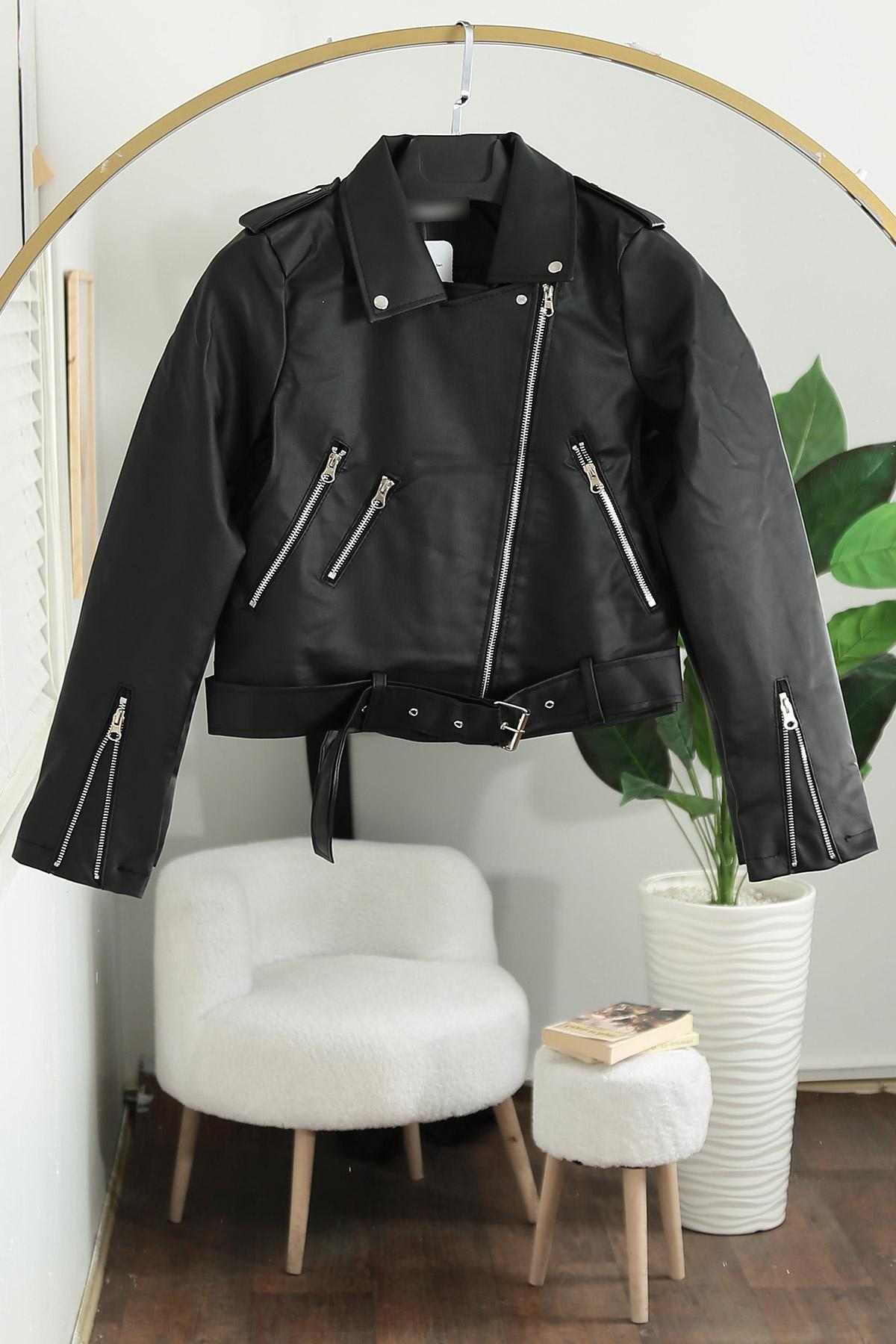 Beli Kemerli Fermuarlı Deri Mont Siyah