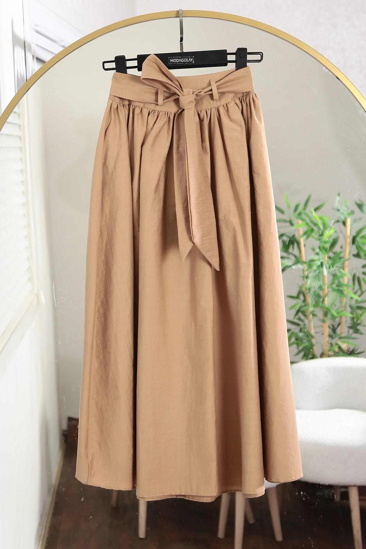 Beli Kuşaklı Vespa Kırınkıl Etek Camel
