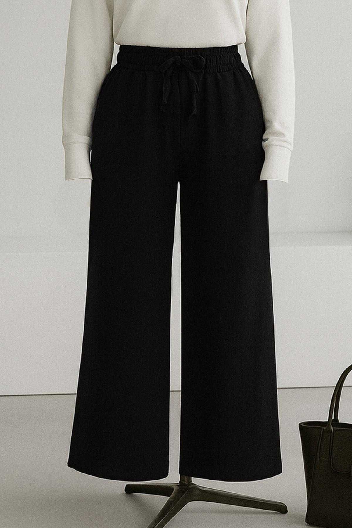 Beli Lastikli Bağlamalı Rahat Kalıp Gabardin Pantolon Siyah