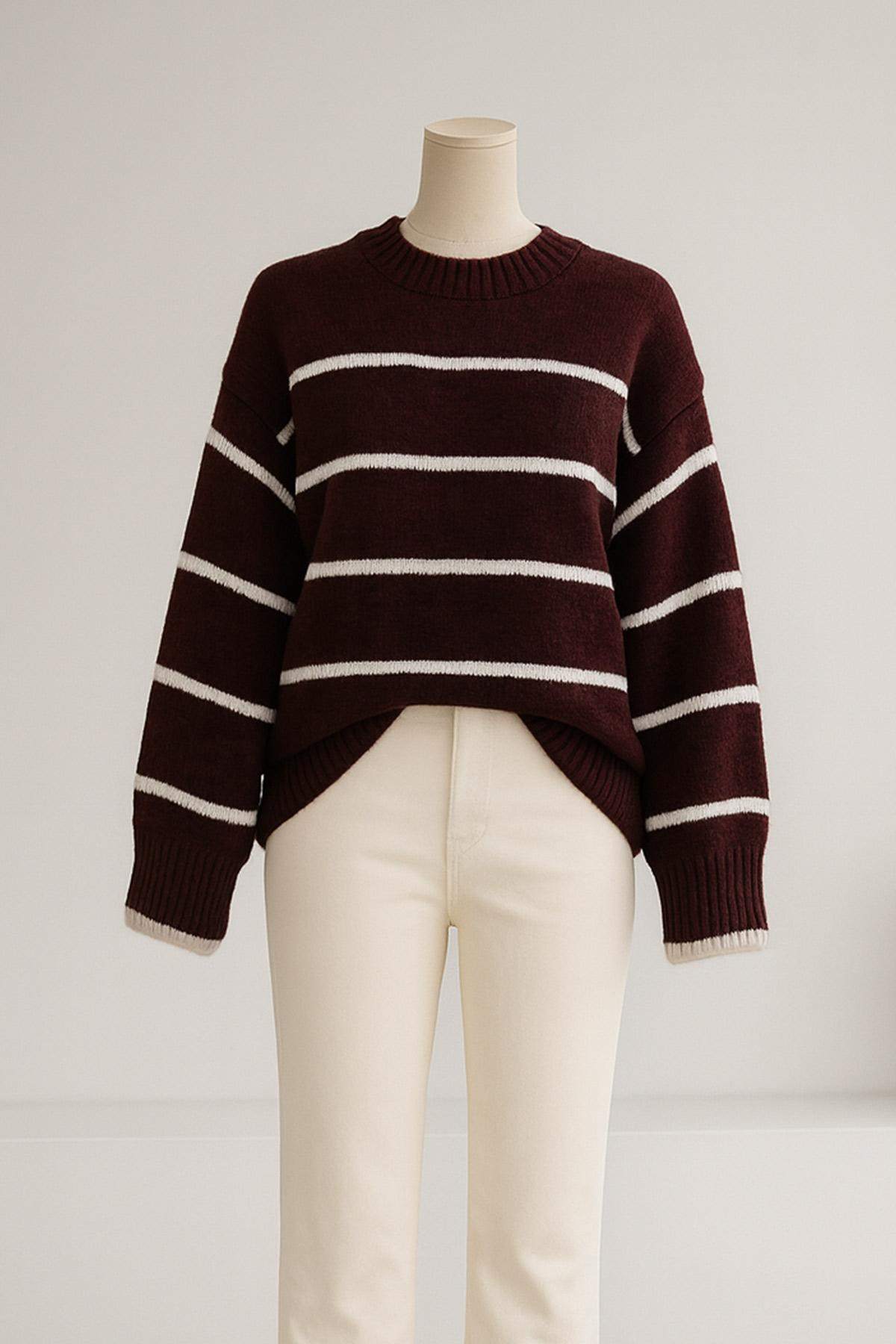 Bisiklet Yaka Enine Çizgili Triko Tunik Bordo