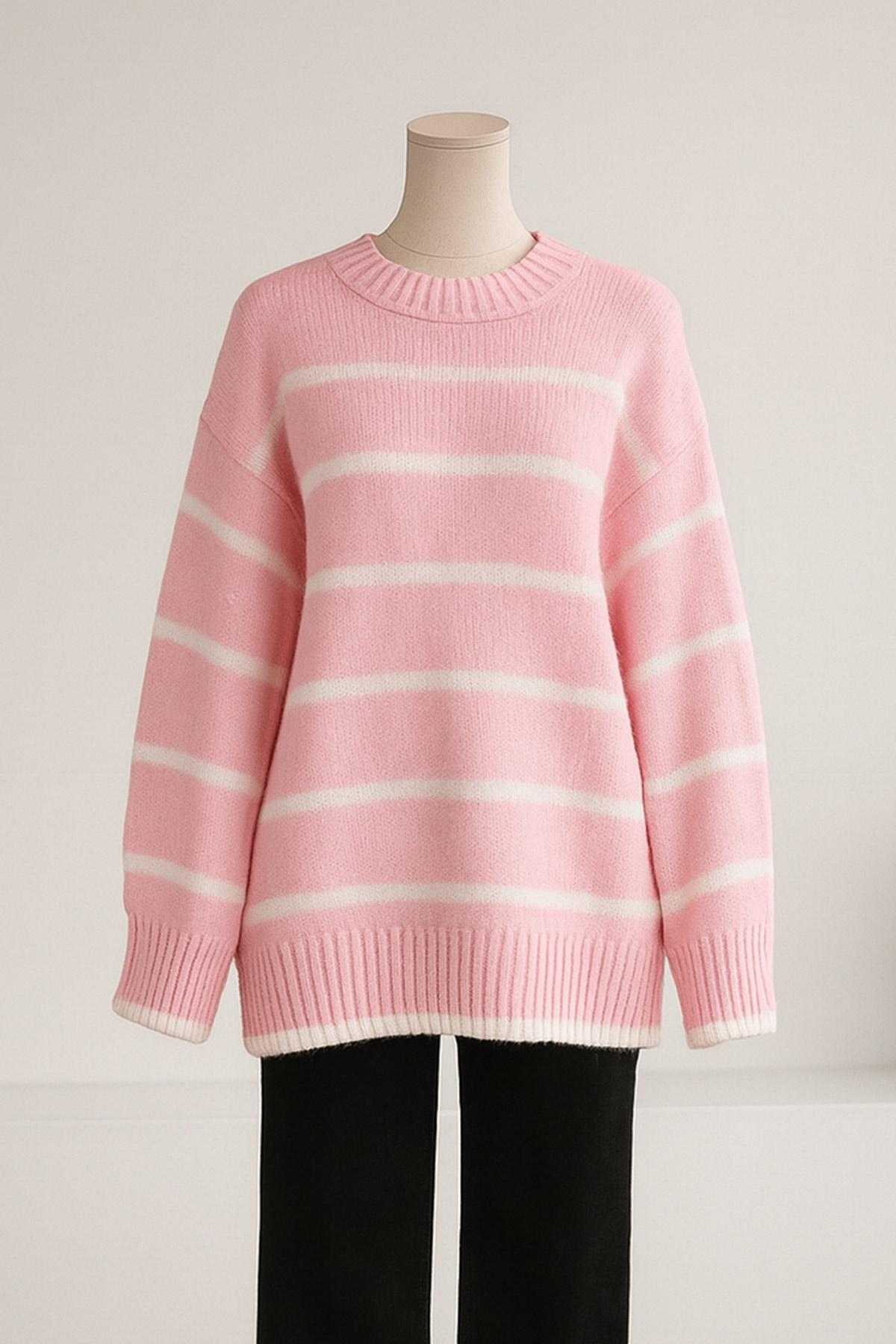 Bisiklet Yaka Enine Çizgili Triko Tunik Pembe