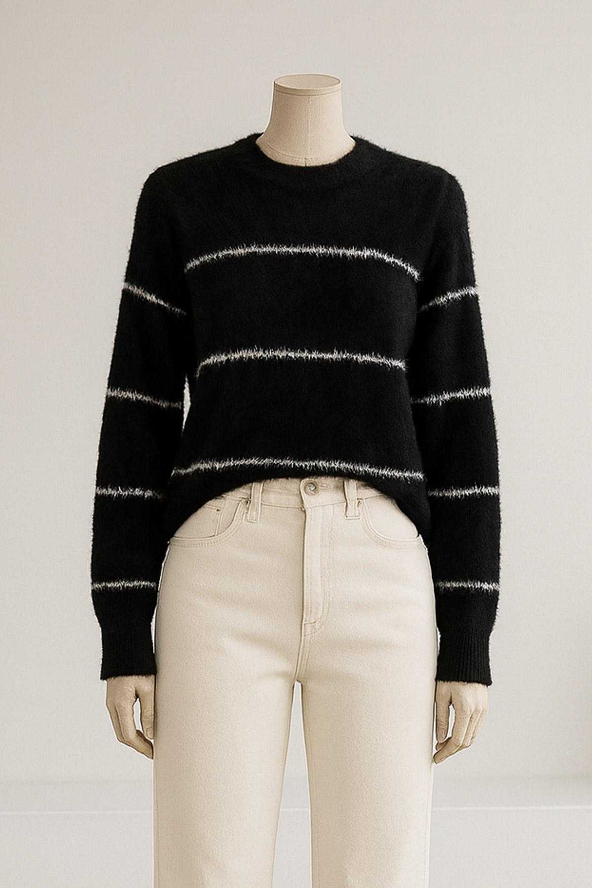 Bisiklet Yaka Enine Çizgili Yumoş Angora Tunik Siyah