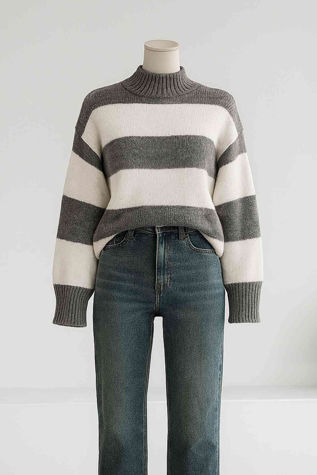 Bisiklet Yaka Geniş Çizgili Triko Tunik Gri