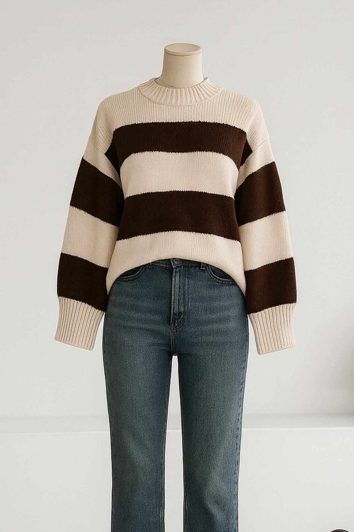 Bisiklet Yaka Geniş Çizgili Triko Tunik Kahve