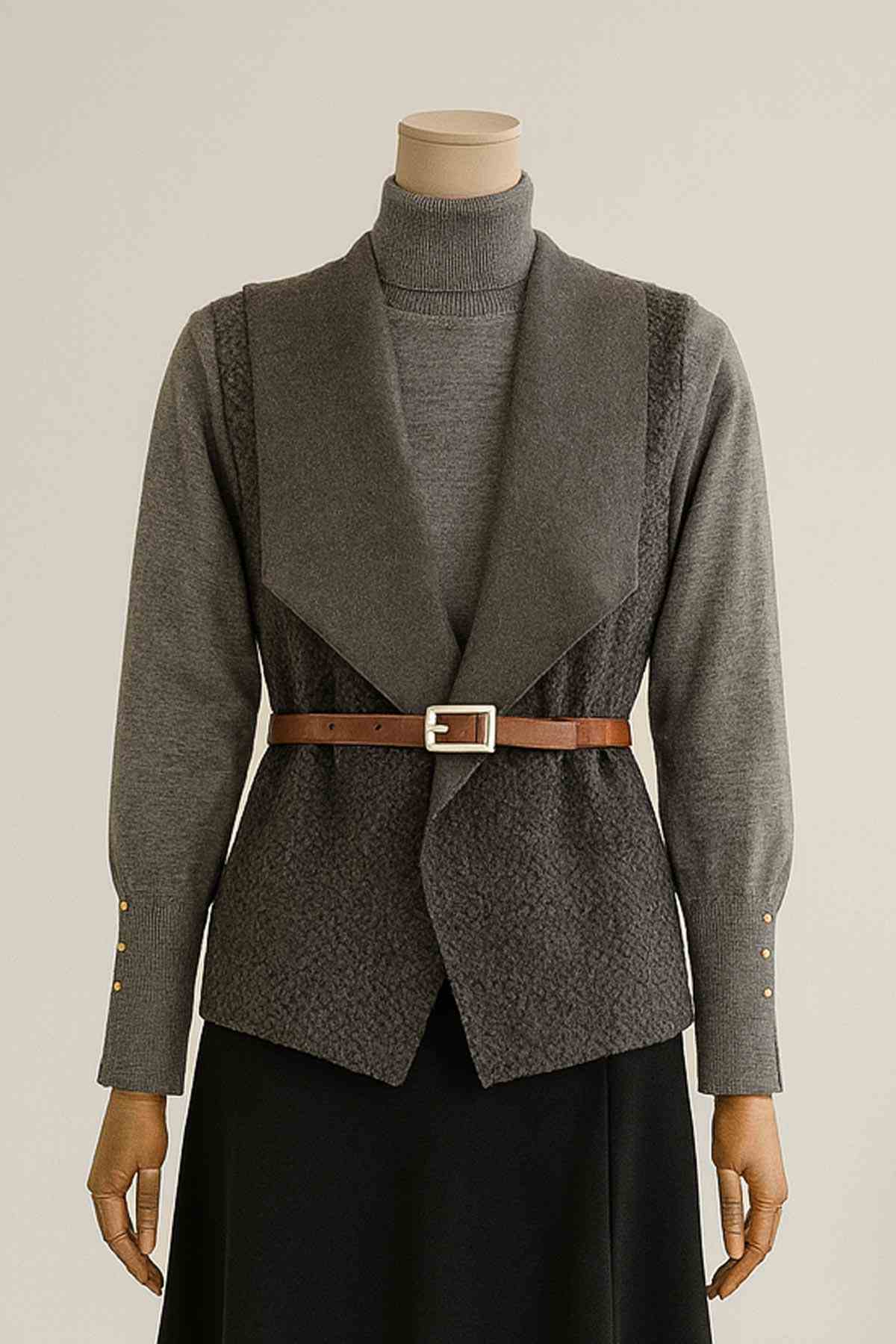 Büyük Yakalı Kemerli Kısa Buklet Yelek Füme