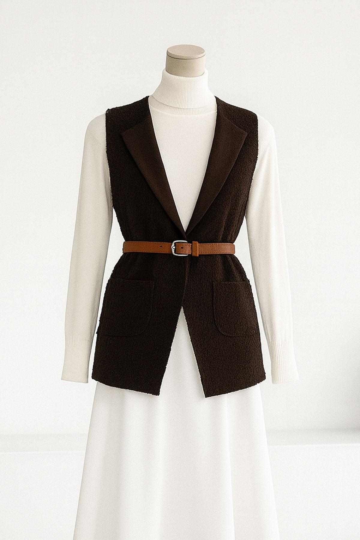 Büyük Yakalı Kemerli Kısa Buklet Yelek Koyu Kahve
