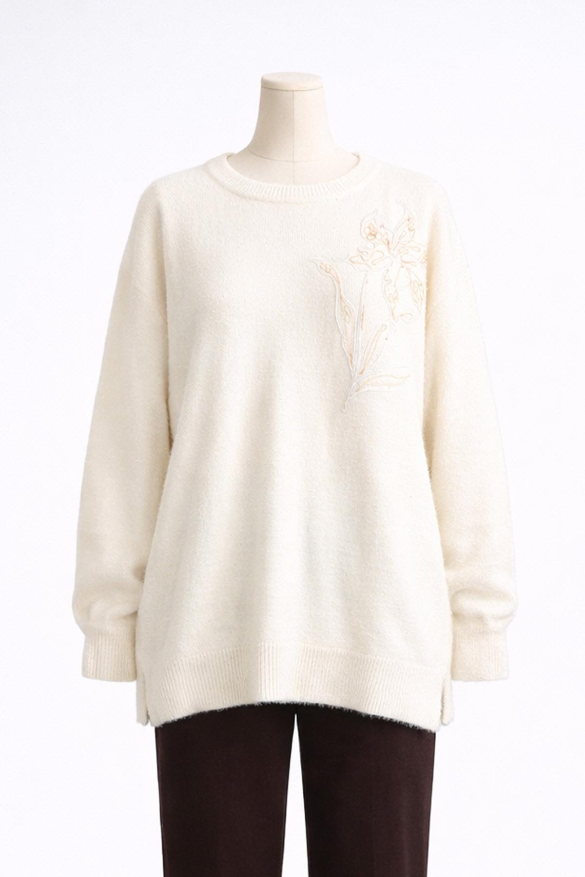 Çiçek Nakışlı Yumoş Örgü Tunik Ekru