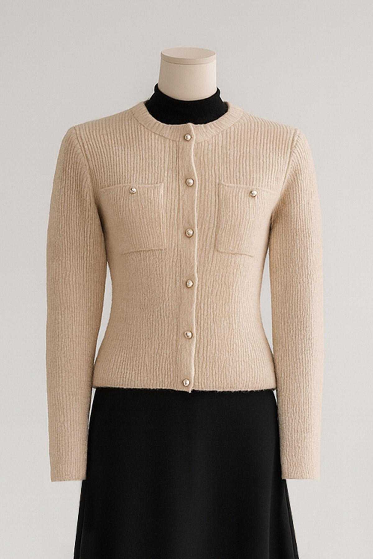 Çift Cepli Fitilli Triko Hırka Açık Bej