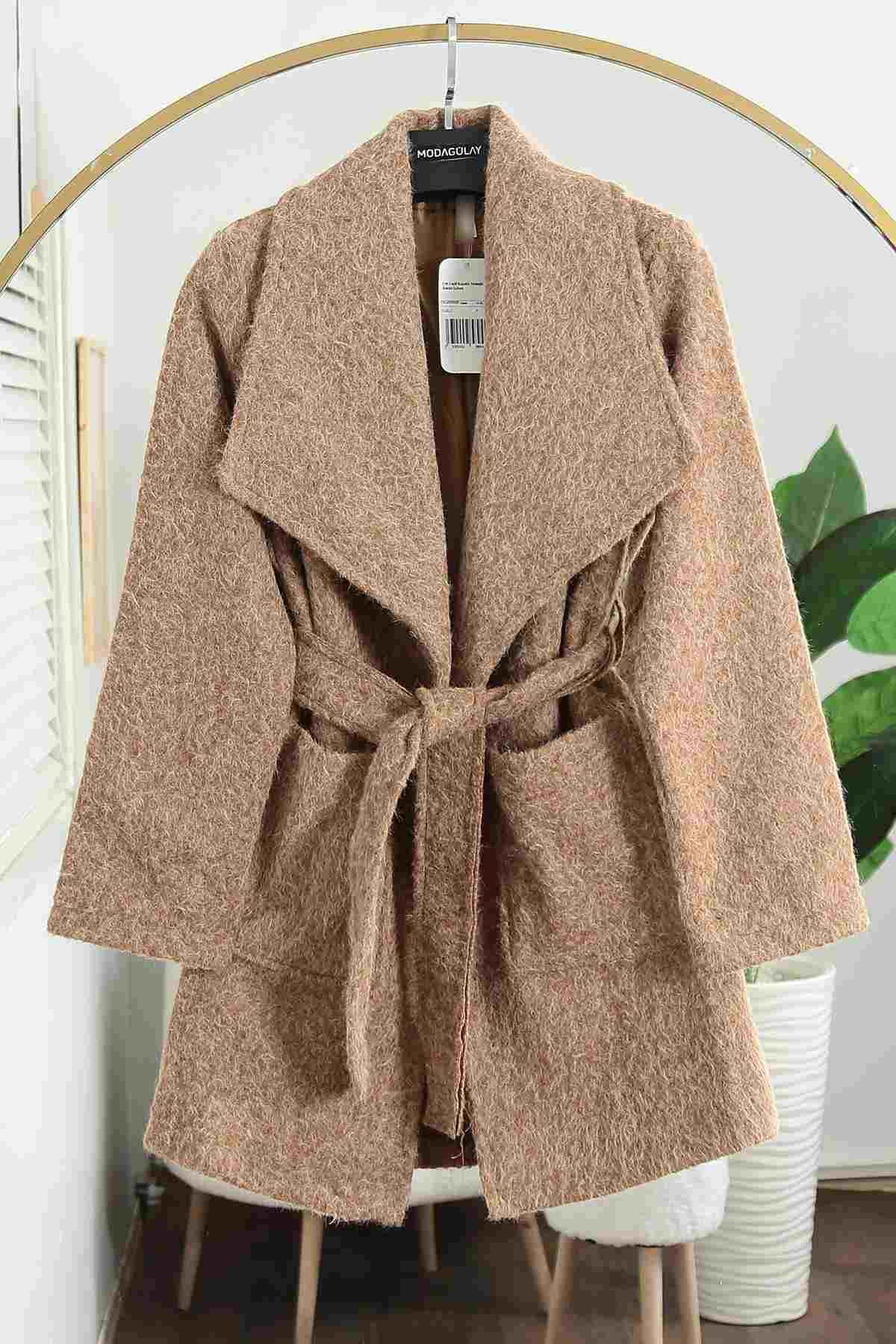 Çift Cepli Kuşaklı Melanjlı Buklet Kaban Camel