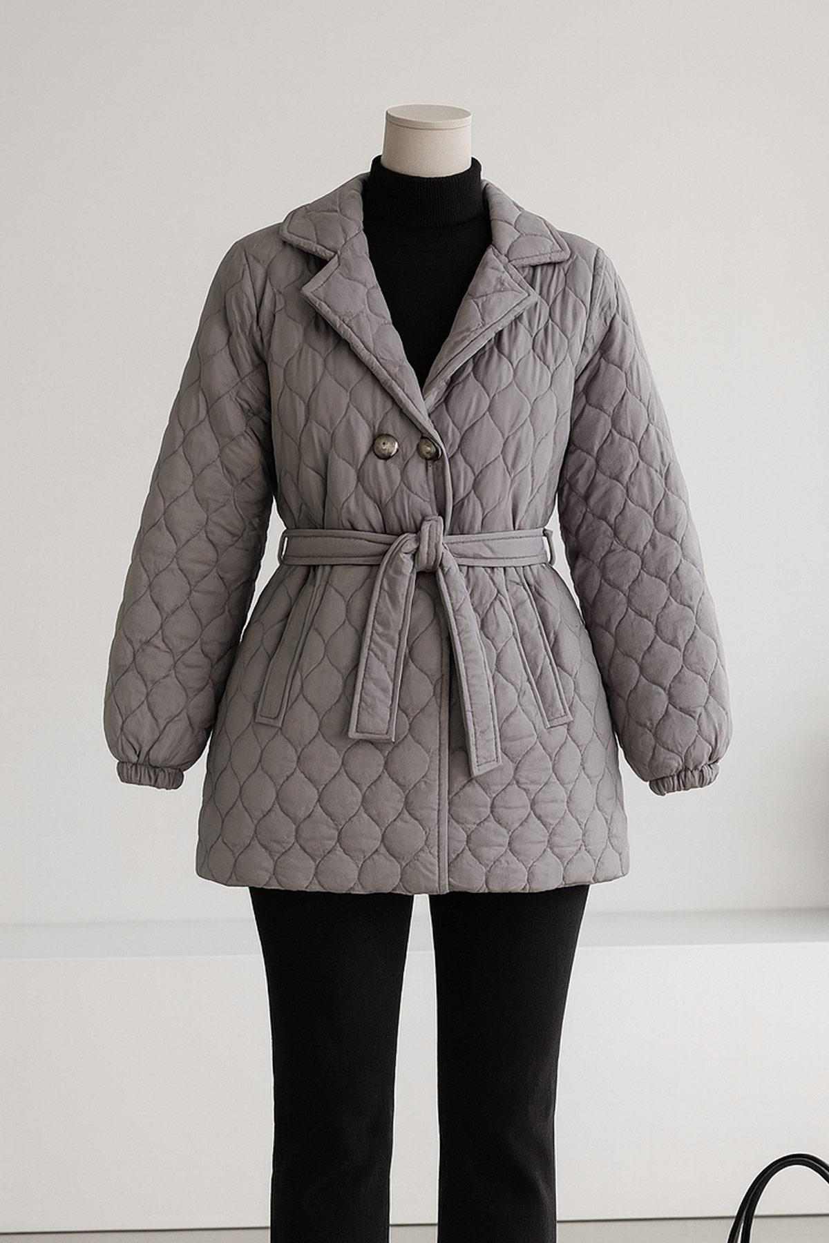 Çift Düğmeli Limon Kapitone Kuşaklı Mont Gri