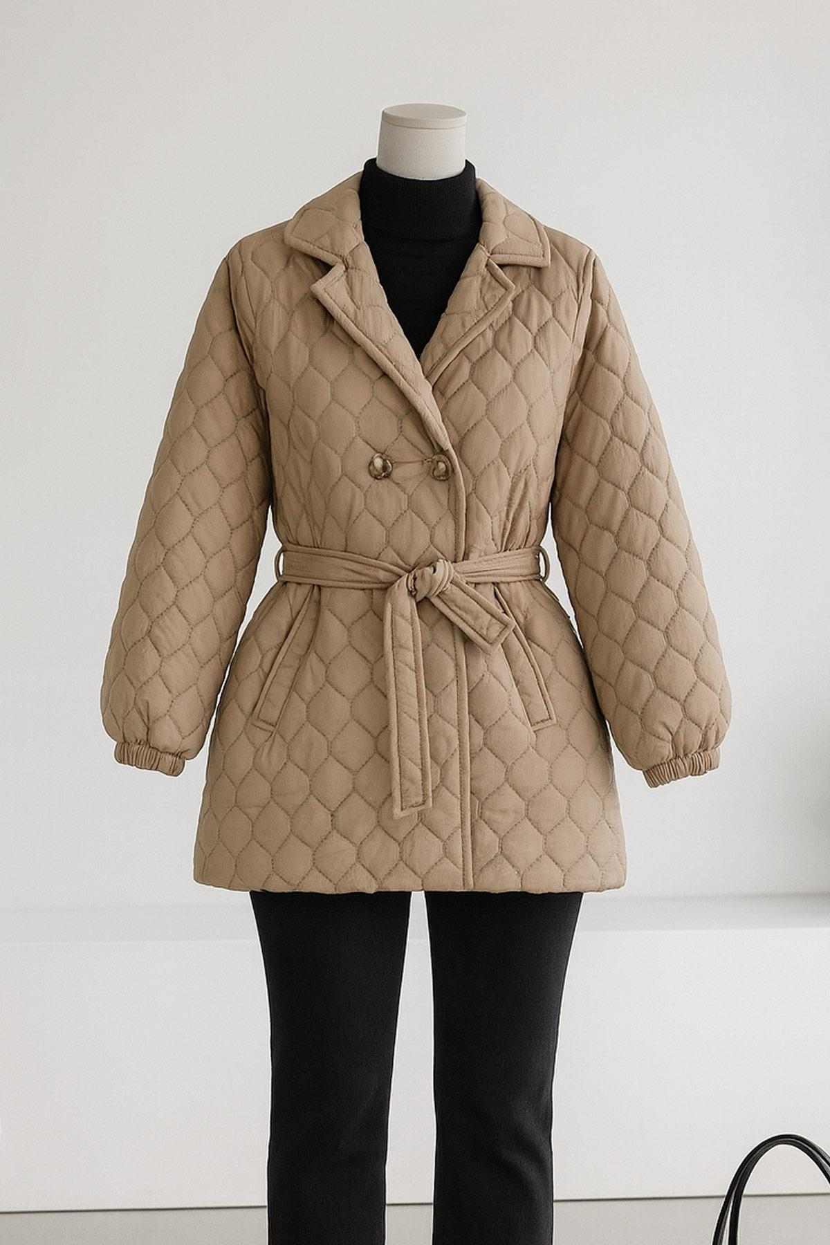 Çift Düğmeli Limon Kapitone Kuşaklı Mont Vizon