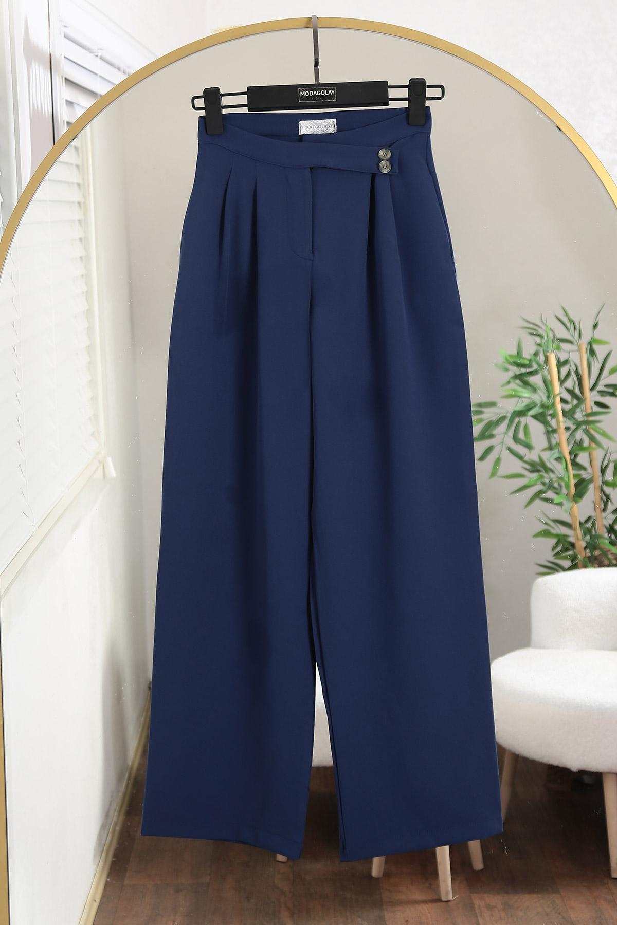 Çift Düğmeli Pileli Bol Paça Dabıl Pantolon Lacivert
