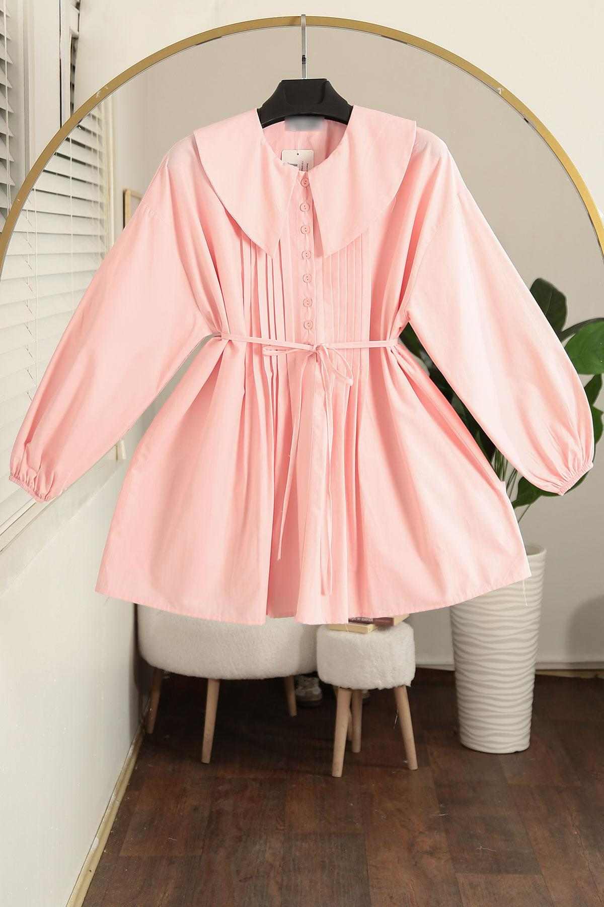 Denizci Yk Nervürlü Kuşaklı Oversıze Poplin Tunik Pembe
