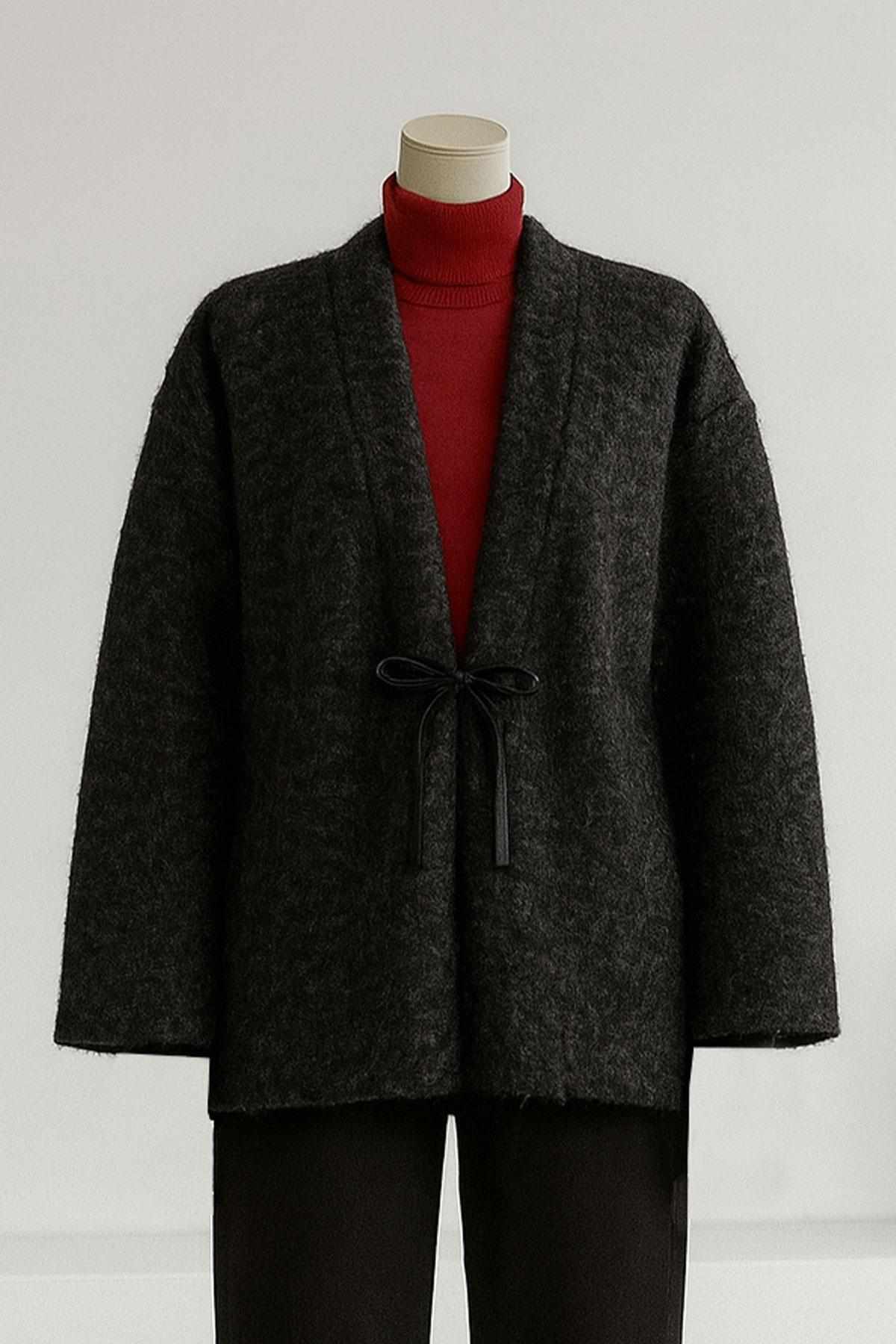 Deri Bağlamalı Oversıze Yünlü Kaşe Ceket Siyah