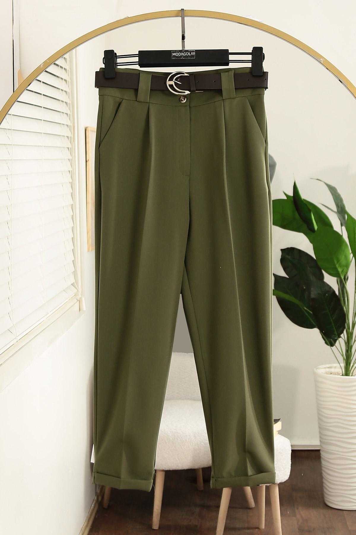 Deri Kemerli Flotolu Dabıl Pantolon Haki