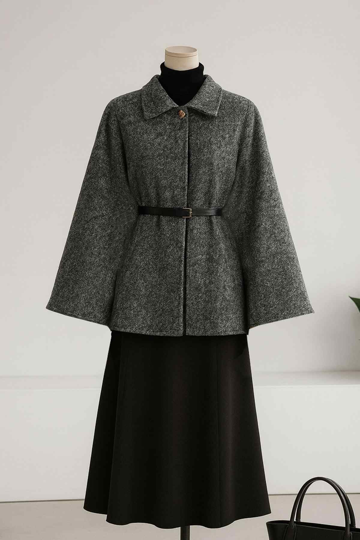 Deri Kemerli Oversıze Yünlü Kaşe Panço Antrasit
