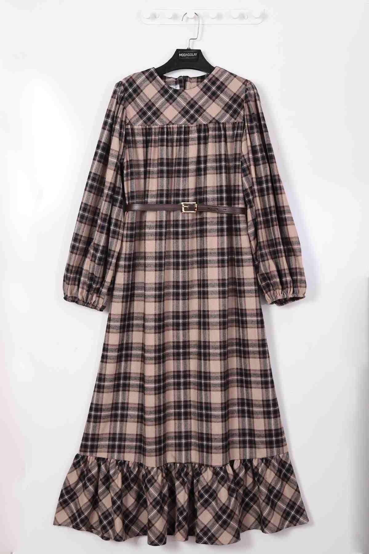 Deri Kemerli Parçalı Ekoseli Elbise Vizon
