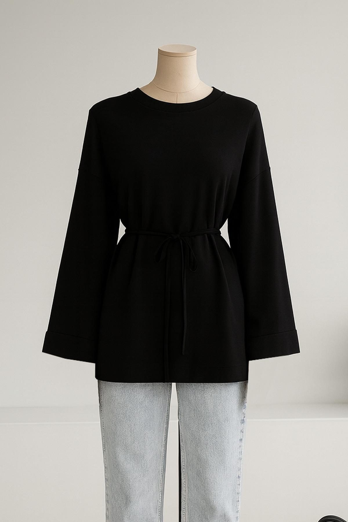 Dikiş Detaylı Yırtmaçlı İnce Bağlamalı Sweat Siyah