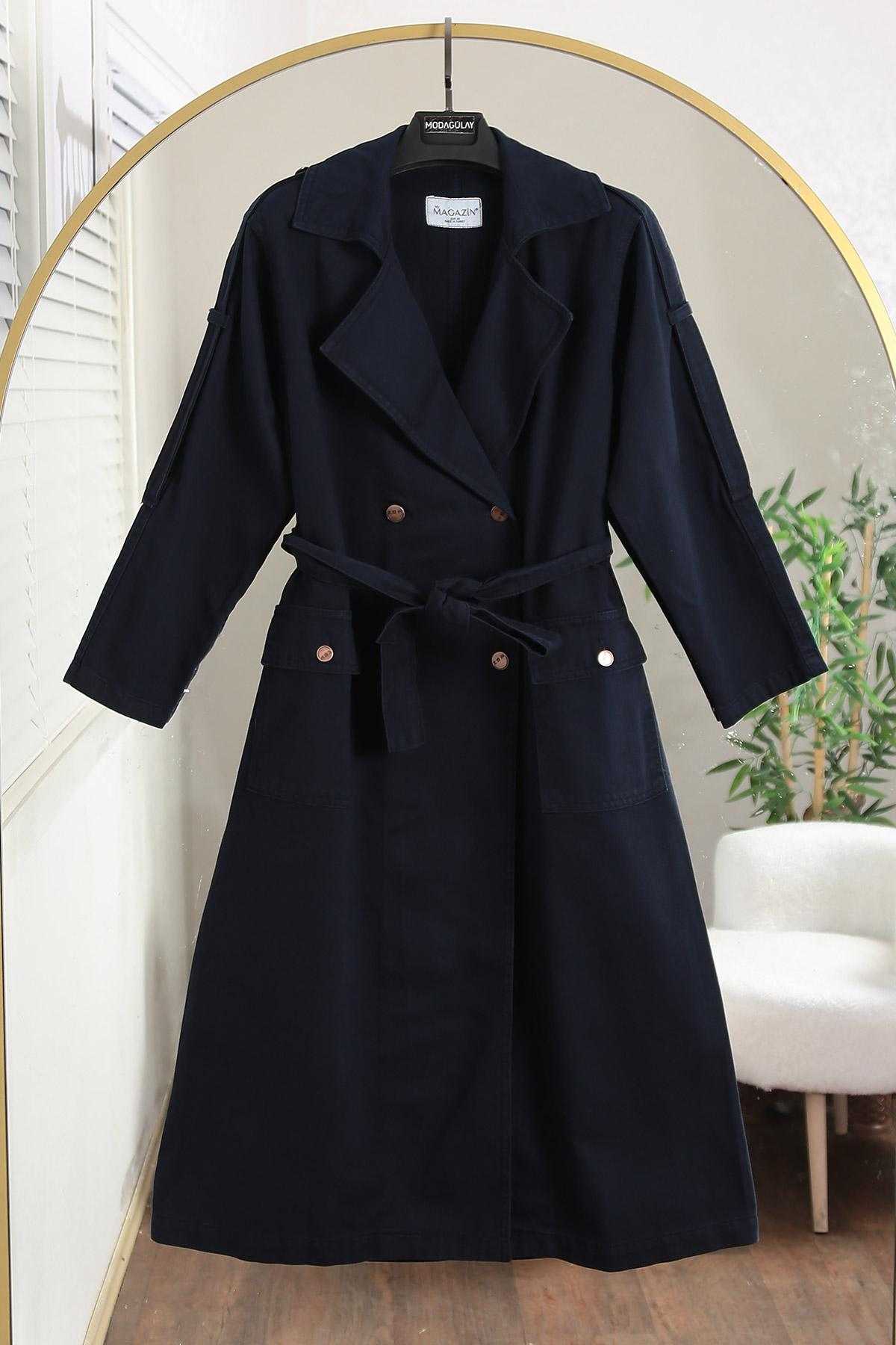 Dört Düğmeli Apoletli Kuşaklı 25 Kot Trenç Lacivert