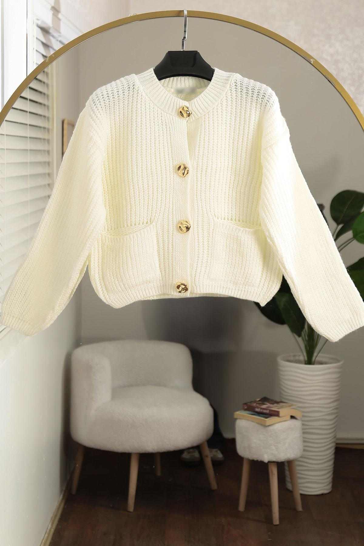 Dört Düğmeli Çift Cepli Triko Hırka Kemik