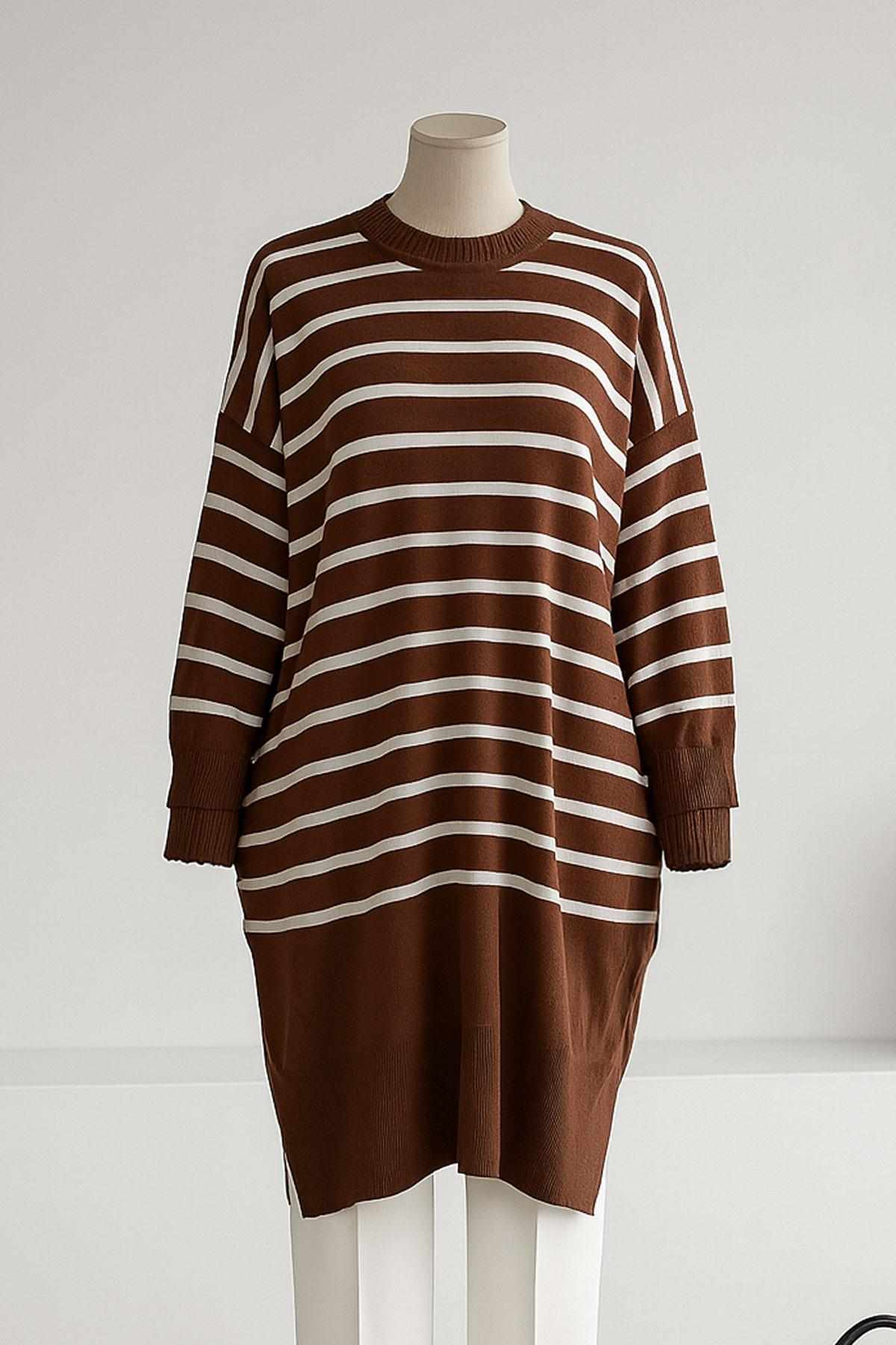 Enine Çizgili Yırtmaçlı Salaş Triko Tunik Kahve Beyaz