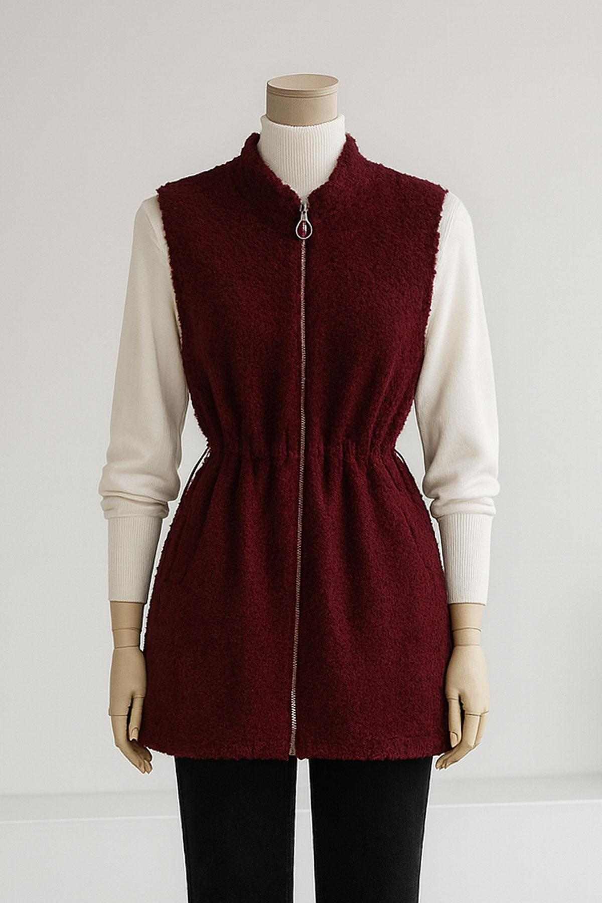 Fermuarlı Çift Cepli Beli Lastikli Buklet Yelek Mürdüm