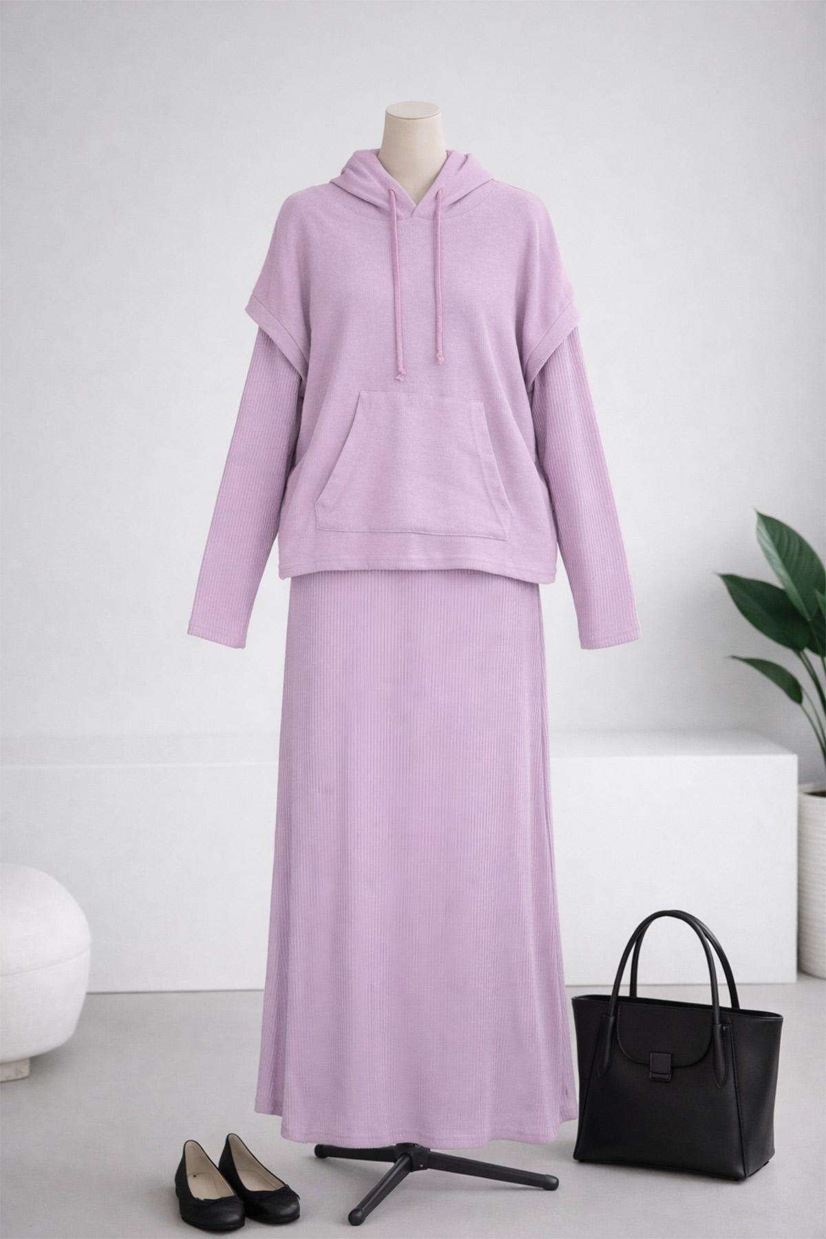 Kapşonlu Fitilli İkili Elbise Lila