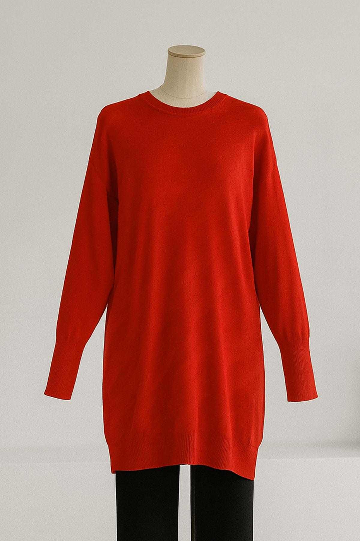 Kendinden Çapraz Desenli Sıfır Yaka Triko Tunik Kırmızı