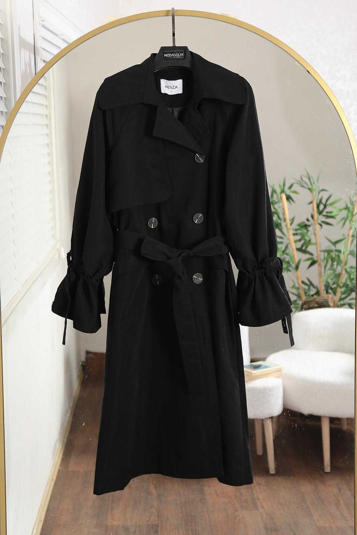 Kolu Büzgülü Kuşaklı Trençkot Siyah