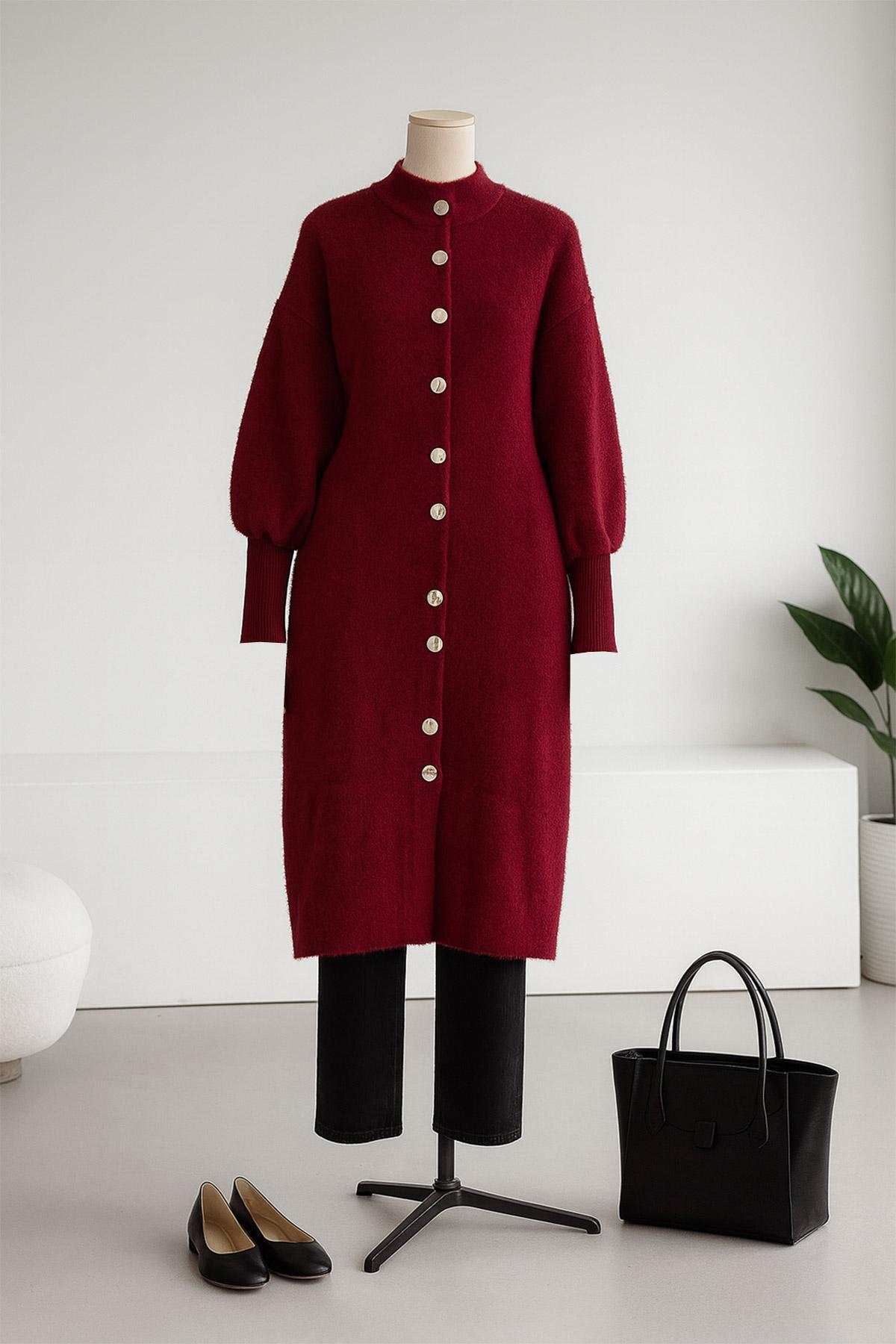 Kolu Fitilli Metal Düğmeli Uzun Yumoş Angora Hırka Bordo