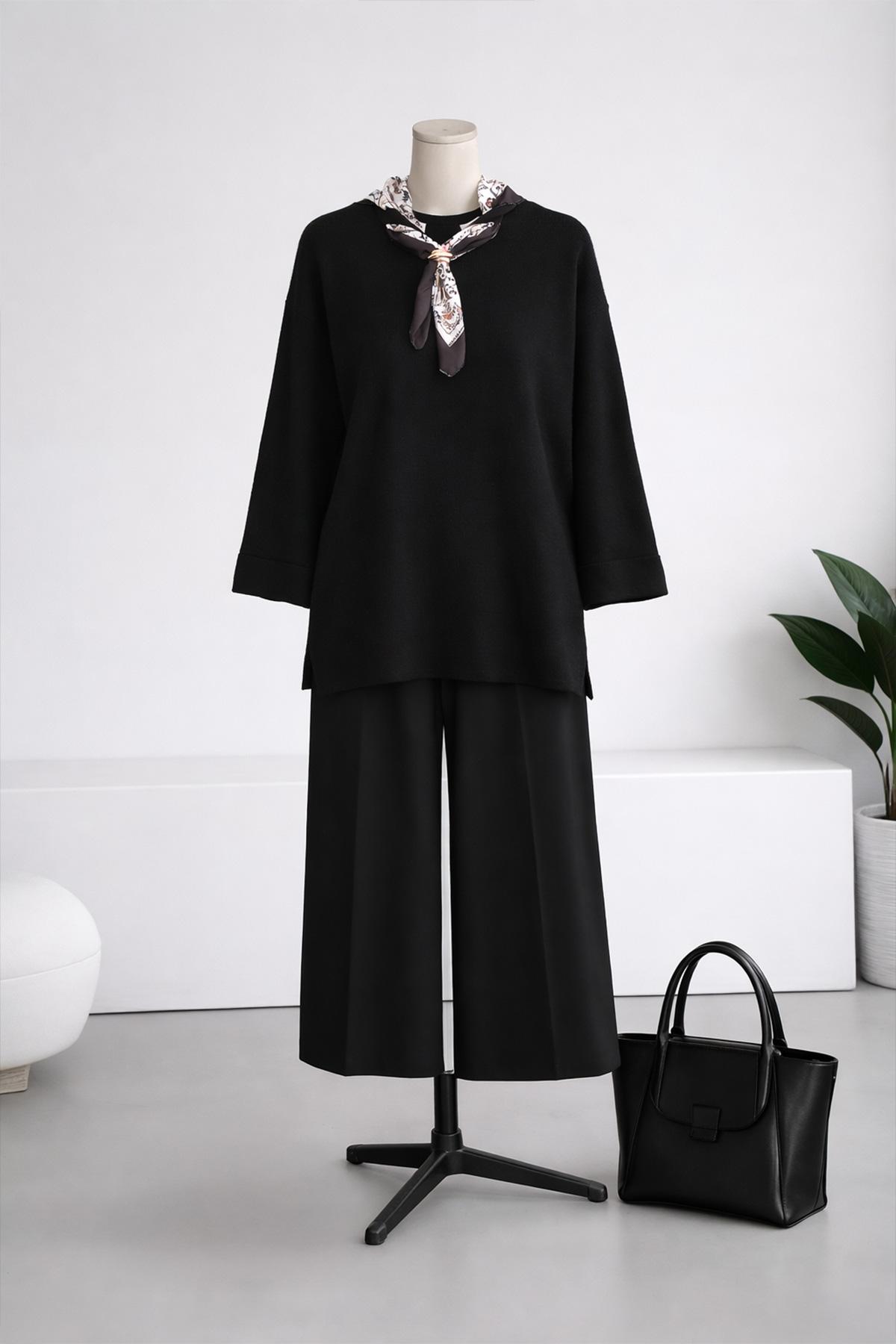 Kolu Katlamalı Fularlı Pantolonlu Triko Takım Siyah