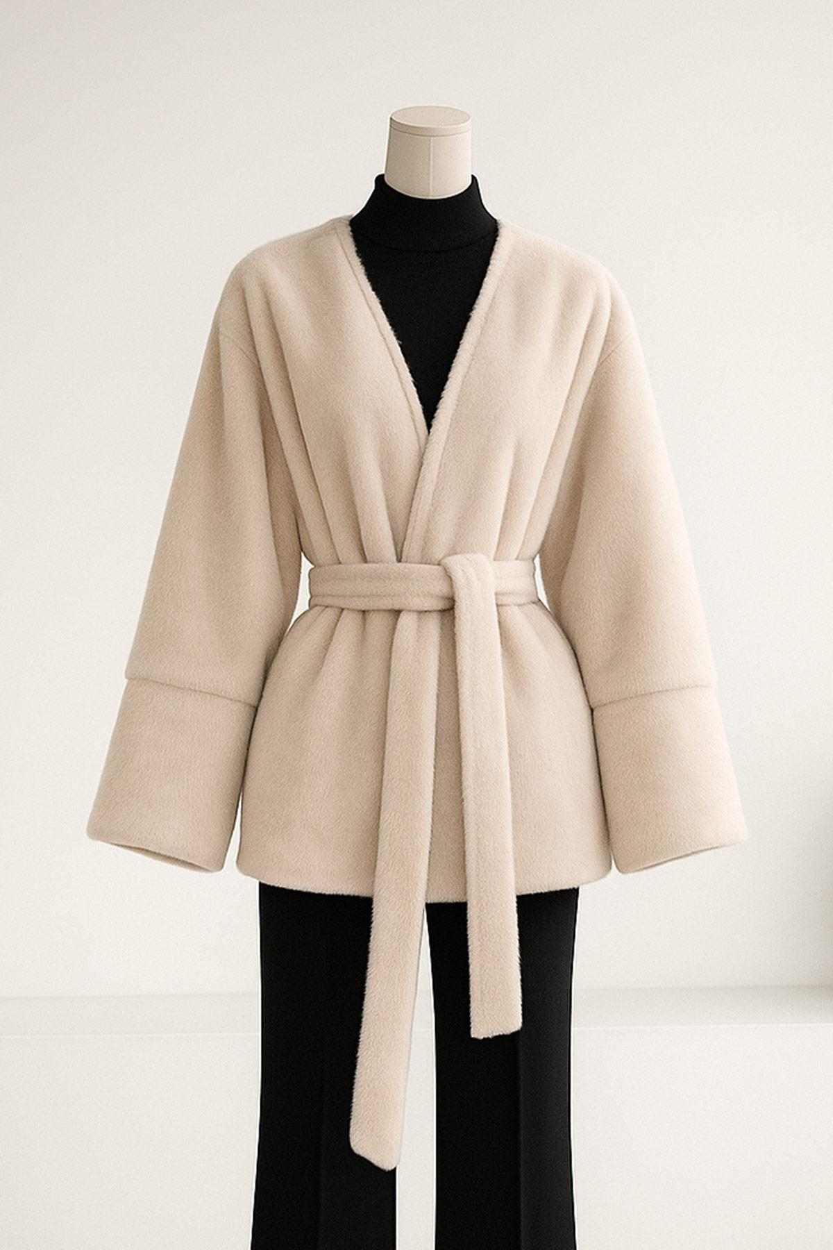 Kolu Parçalı Oversıze Astarlı Kuşaklı Fox Kürk Kaban Vizon