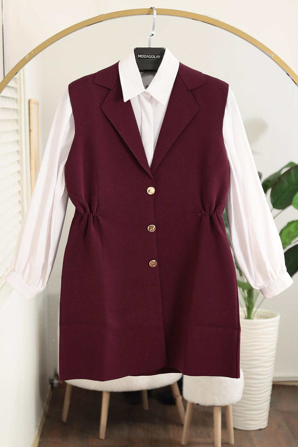 Kruvaze Metal Düğmeli Yanları Büzgülü Yelek Mürdüm
