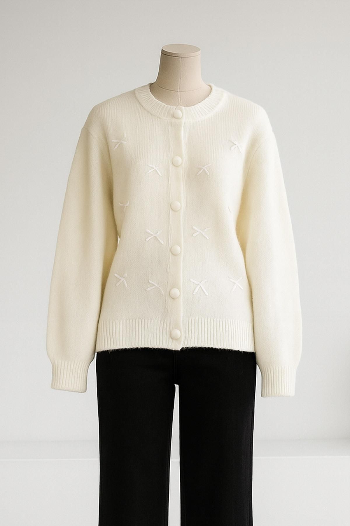 Kurdelalı Düğmeli Triko Hırka Kemik