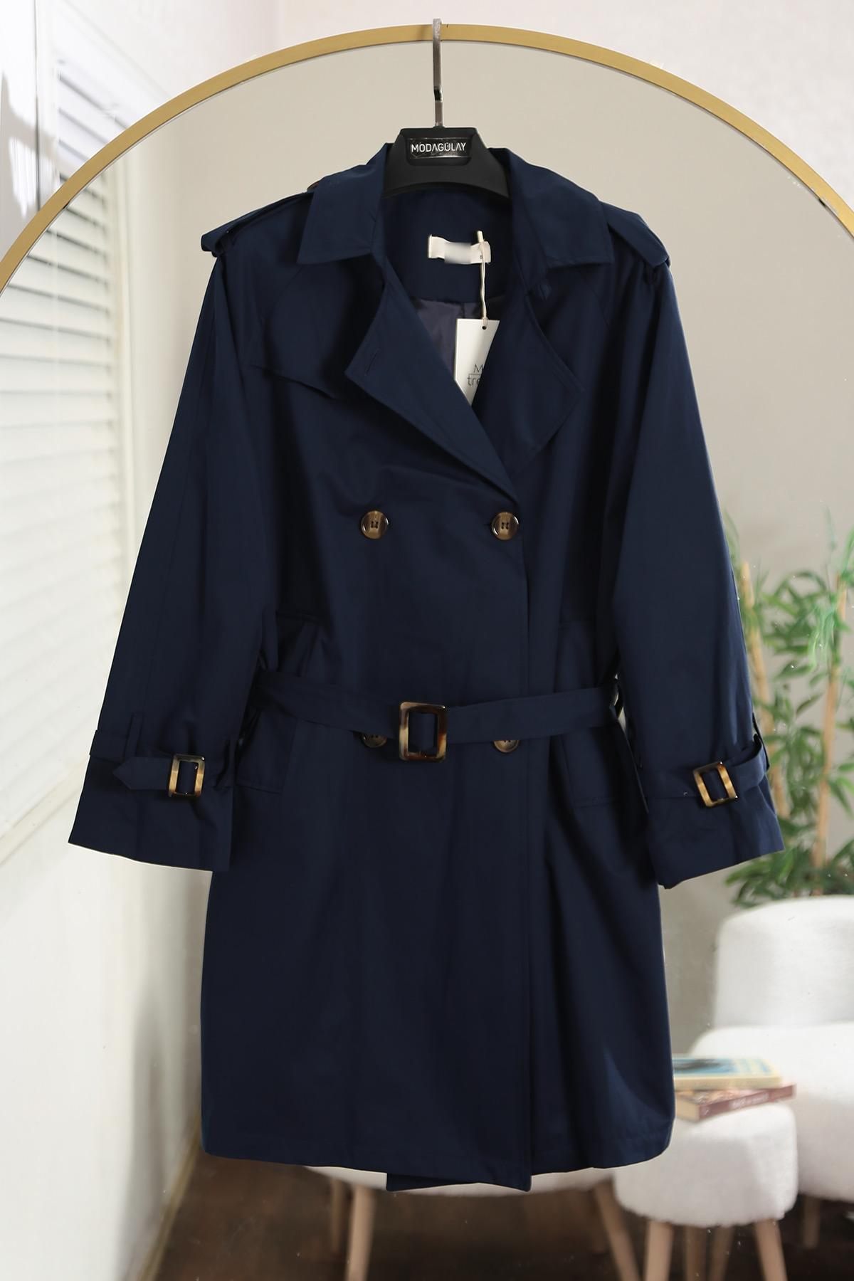 Kuşağı Kolu Tokalı Dört Düğmeli Trençkot Lacivert