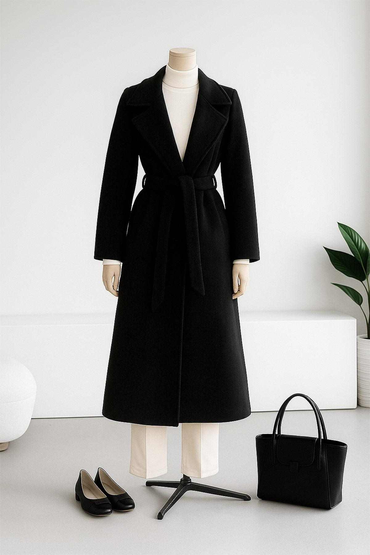 Kuşaklı Men Yaka Moskova Kaşe Kaban Siyah