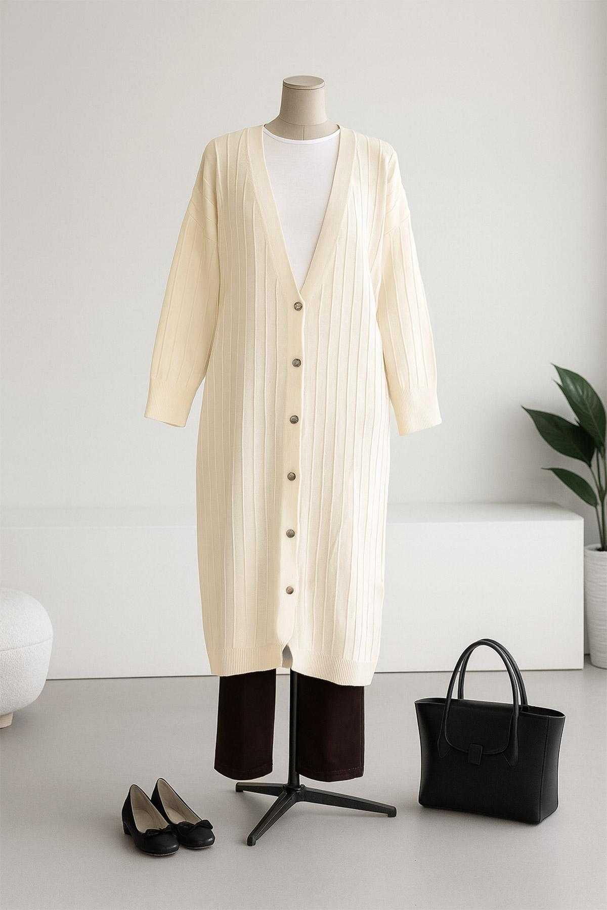 Metal Düğmeli Kendinden Çizgili Triko Hırka Ekru