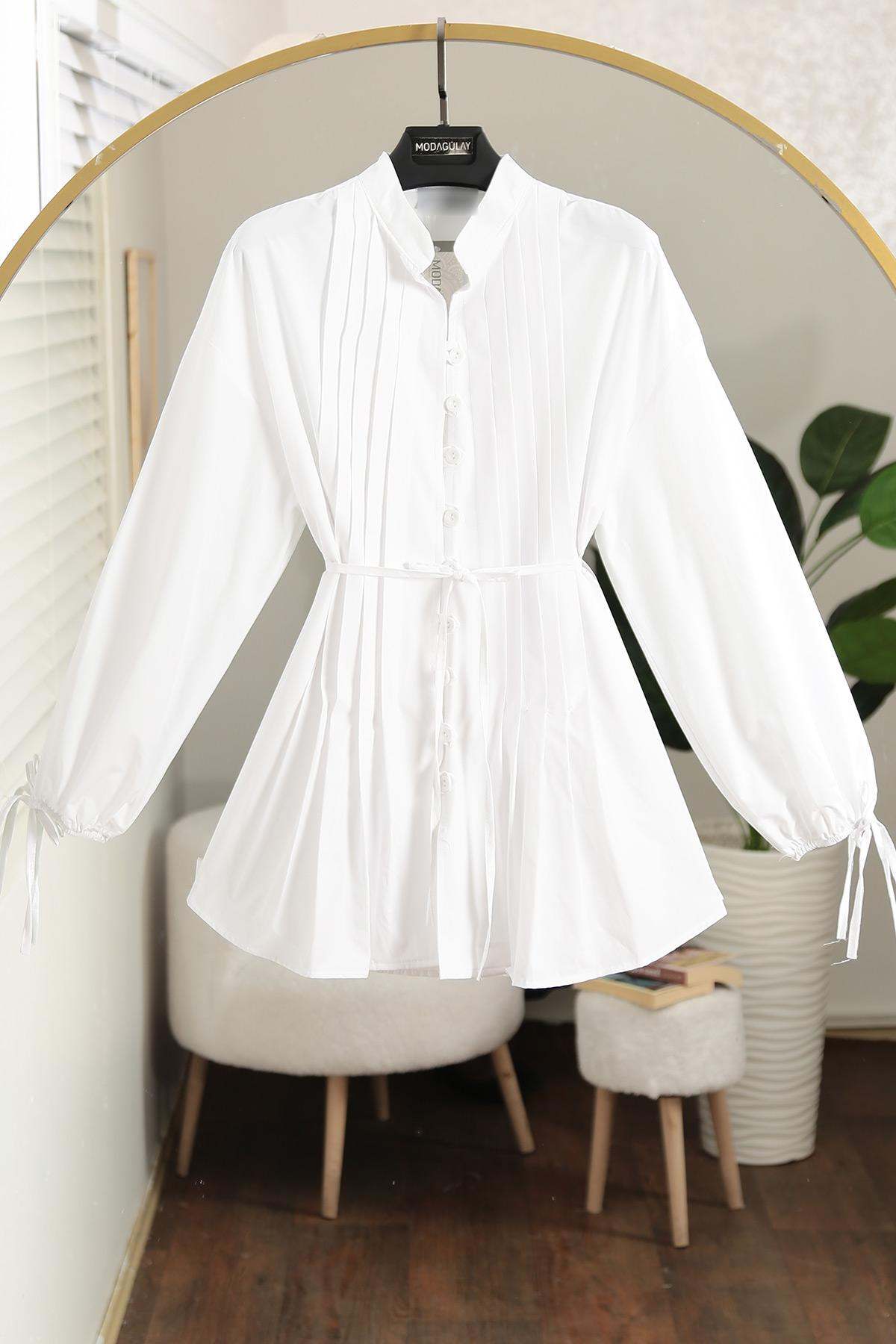 Nervürlü Bağlamalı Poplin Gömlek Beyaz