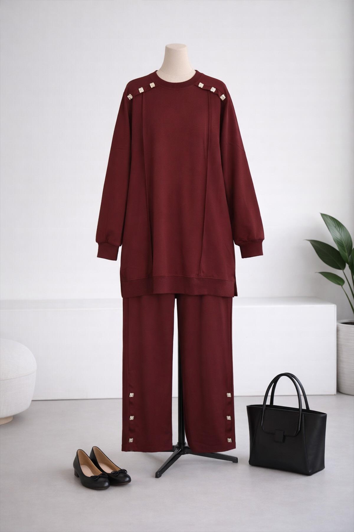 Omuzları Paçaları Düğmeli İkiiplik Takım Bordo