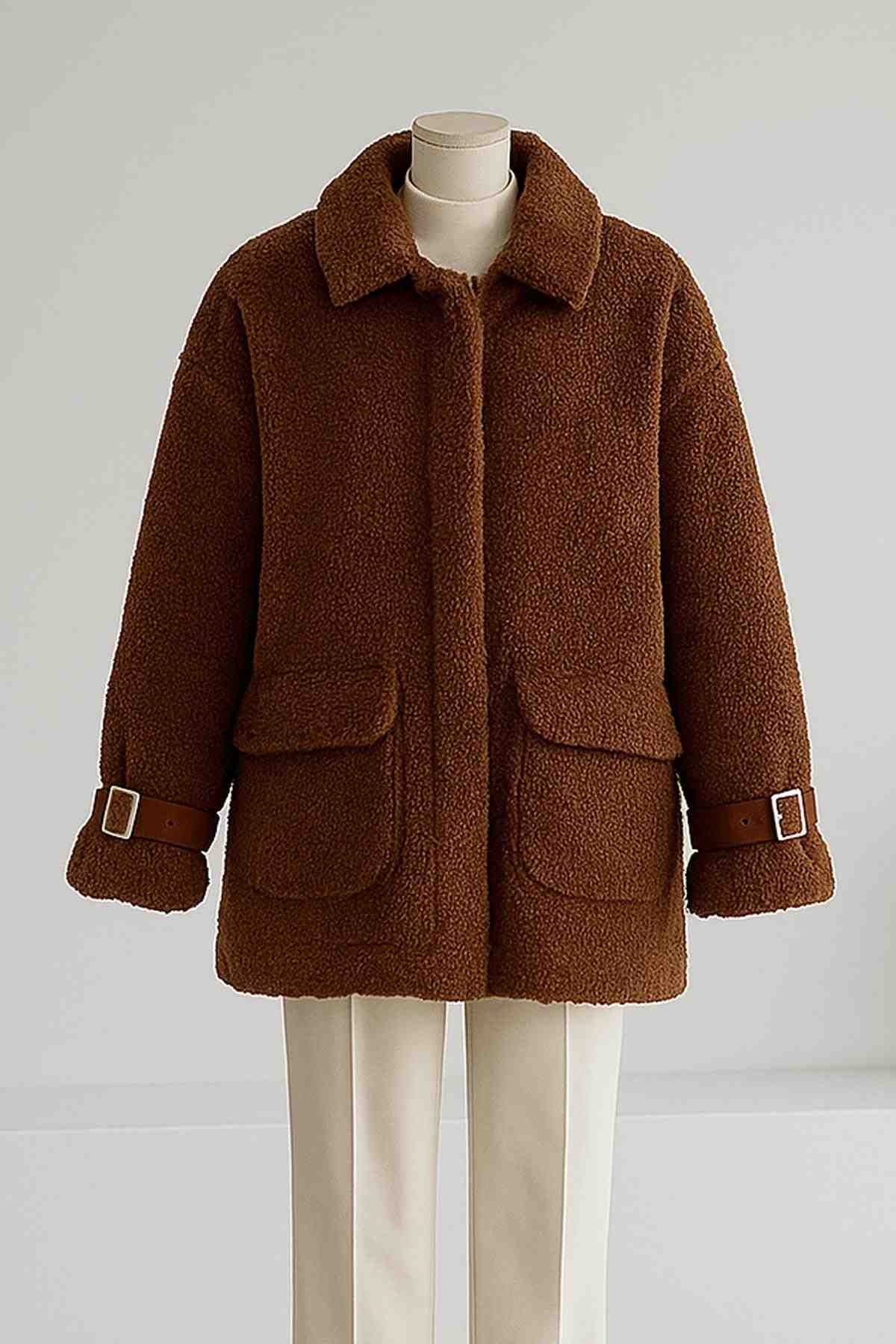 Oversıze Kolları Deri Kemerli Çift Cepli Peluş Mont Kahve