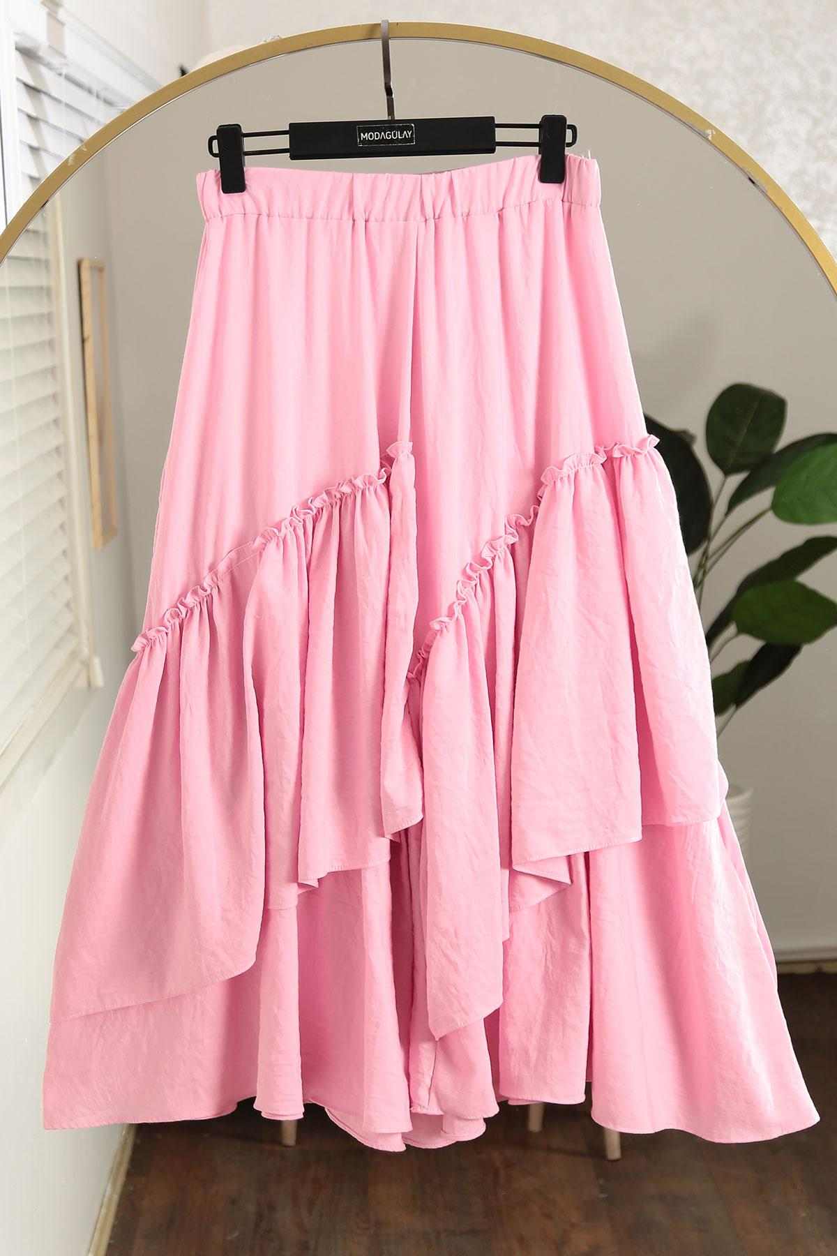 Parçalı Fırfırlı Pamuk Aerobin Etek Pembe