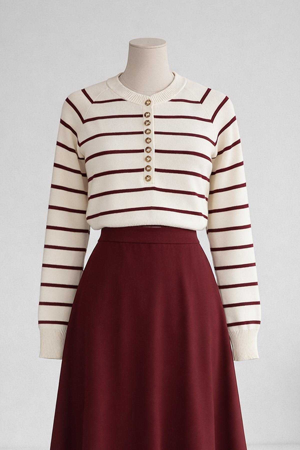 Patı Çok Düğmeli Enize Çizgili Triko Kazak Ekru Bordo